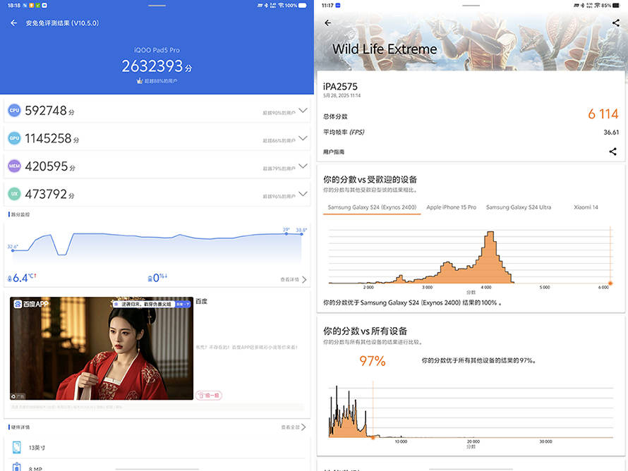 再来看性能,iQOO Pad5 Pro搭载了天玑9400+芯片,这也是安卓平板首发这颗芯片。基于台积电3nm工艺打造,采用了超大核架构和G925 GPU。其中CPU性能提升28%,GPU性能提升41%,结合LPDDR5X内存和UFS4.1闪存,为iQOO Pad5 Pro提供了极为流畅的性能表现。