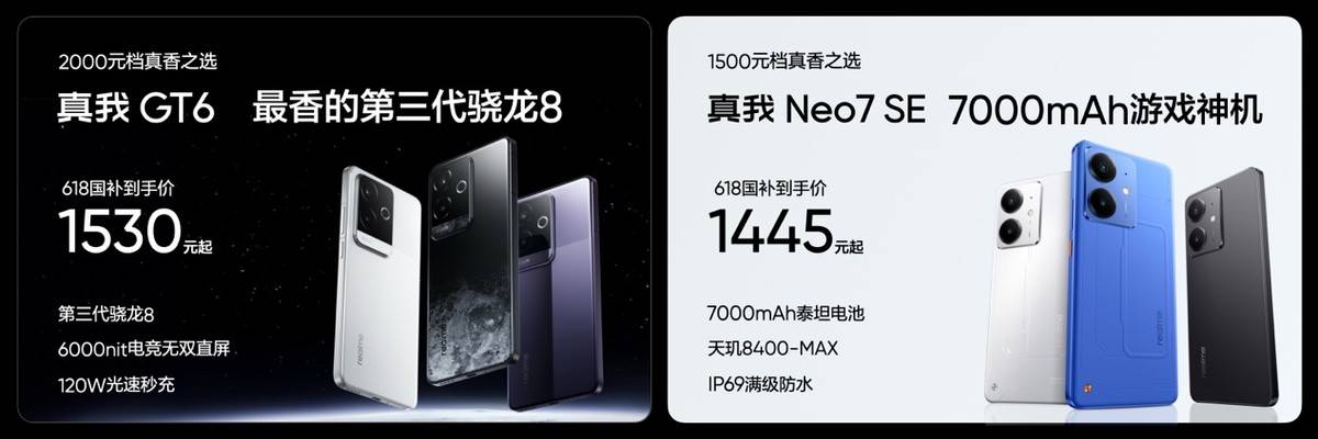 此次新品发售正值真我真香618活动,期间购买真我产品至高享1000元补贴,还有24期免息、超高以旧换新补贴等福利,包括真我GT7 Pro、真我GT7、真我GT6、真我Neo7 SE等真香机型,都将提供优惠。