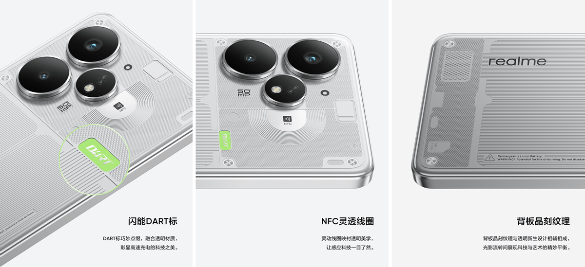 设计细节上,真我Neo7 Turbo采用激光精雕多纹理拼接工艺,让每一处线圈走向和纹理细节,都以极具秩序感的方式呈现在眼前。透明背板近乎1:1还原内部精密排布,晶刻纹理、NFC线圈以及闪能DART标三大元素,做到了科技美学与功能性相融合,撞色的闪能 DART 标,释放出强劲而鲜活的科技生命力,同时也致敬了真我闪充的越级之路。