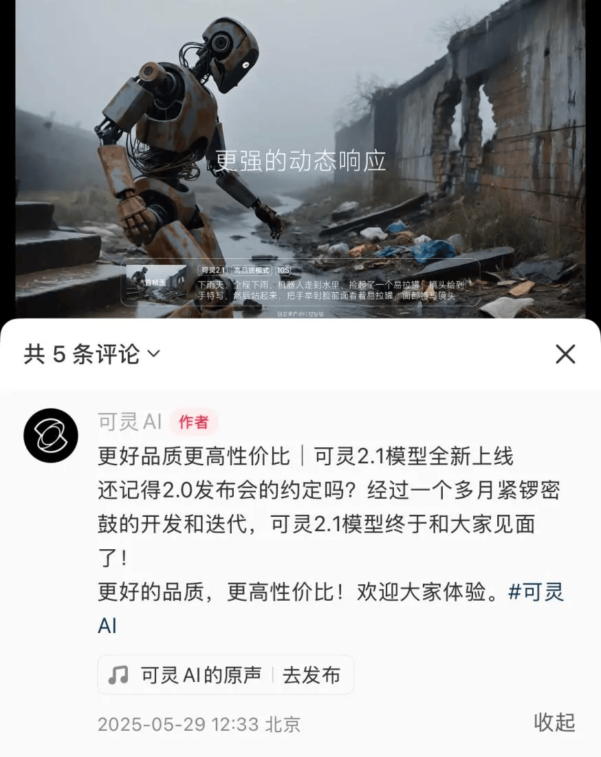 5月29日,快手可灵AI正式宣布推出全新2.1系列模型。