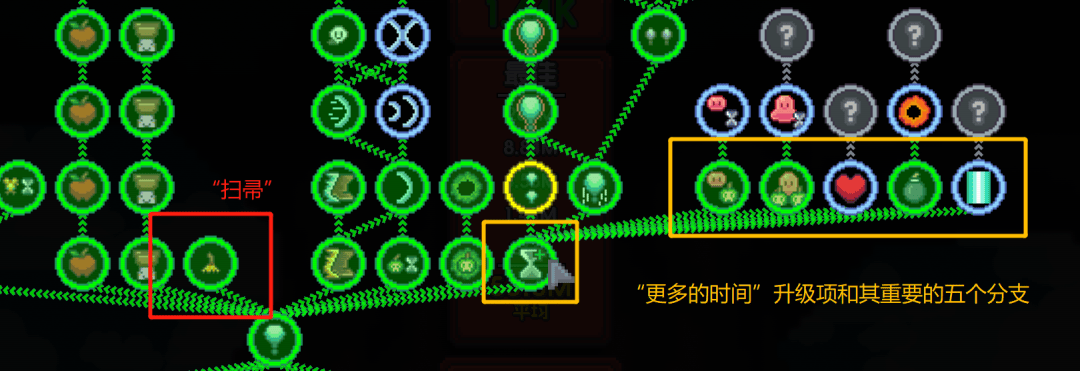 “更多的时间”右侧分支中的前两个升级项。升级这两项及其进阶项后,玩家的游戏时间将大幅增加,足以摆脱倒计时的限制(如果不升级,就算其他项的等级再高,游戏也会很快结束)