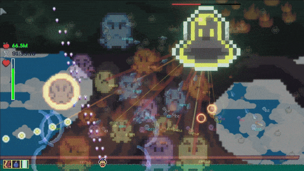 第三阶段则从解锁了“扫帚”和“更多的时间”,以及其他五个升级项开始。在这一阶段,游戏目标不再是“接到苹果以提高分数”或“击中烂苹果以延长倒计时”,而是要“躲避子弹,击杀源源不断的 Boss,存活更久,取得更高分数”,玩法类似弹幕射击街机游戏。