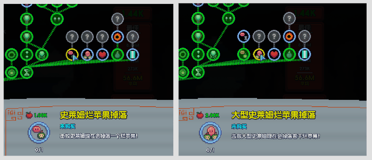 玩家接触到变种迷你游戏的途径有两种——“解锁升级项”和“推进游戏”。其中“解锁升级项”可以以“采摘苹果”为例: