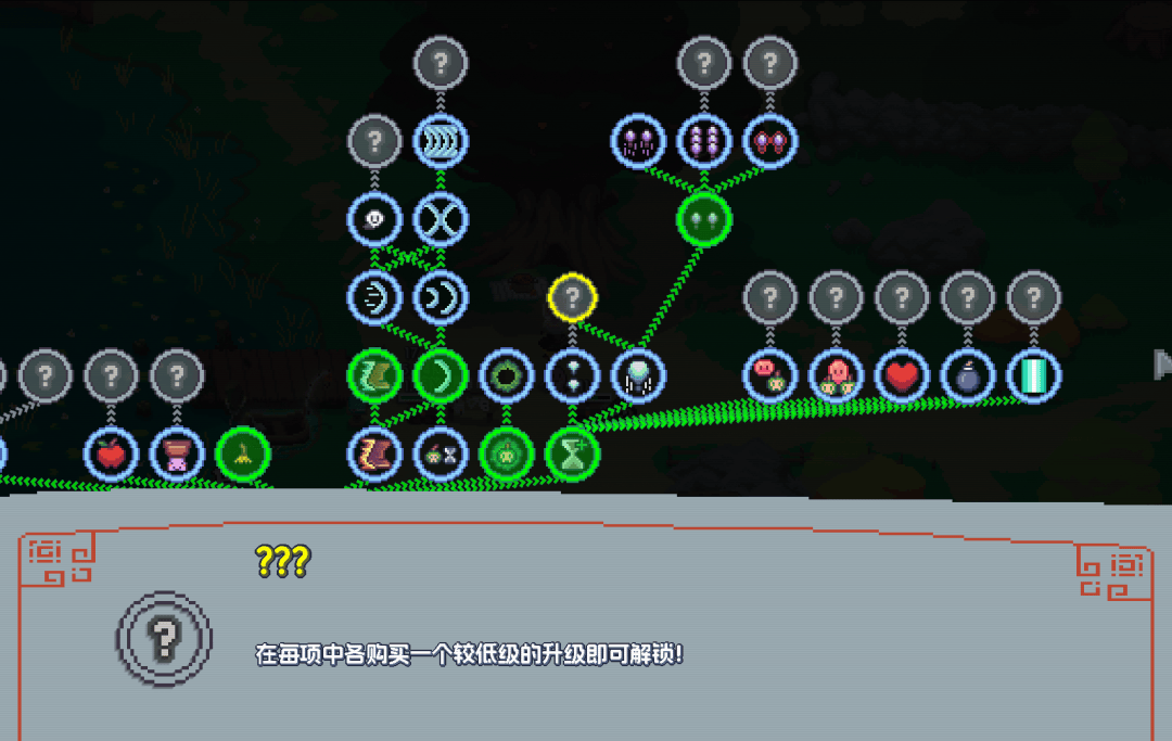 首先,“解锁升级项”是玩家自行做出的选择,过程中的每一步都带着“我(或许)马上要发现游戏新玩法”的期待,而“主游戏流程推进”是被地图进度推着走的,玩家更像是在完成“到达某地解锁新规则”的固定任务。何况,当看到游戏地图标注着“沼泽区域”时,玩家其实已经预感到这里会有泥潭之类的设定,惊喜感自然大打折扣(而在升级分支中,不解锁基础升级项就无法看到部分高级项的信息)。