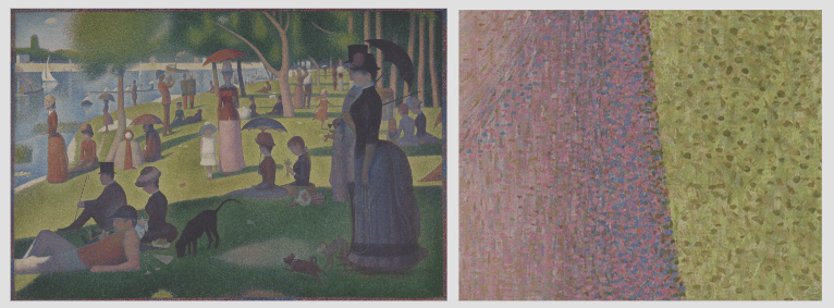 这种套娃式的关系,很像“新印象派”(或称点彩派)绘画里的点彩做法——画家基于光学颜色混合法,将纯色的小点紧密地排列在一起。根据透视法,观者与画面保持一定距离后,这些色点会在观者的视野里缩小(近大远小),其与相邻色点之间的距离也会缩短,从而在观感上模糊为一片色块。同理,色块又会在更远的距离进一步模糊,若合理缜密地安排色块的布置位置,就可以形成完整的、悦眼的画面。