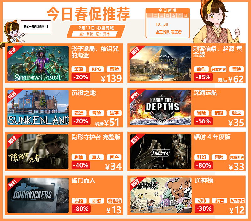2 月 11 日大年初二,今天照例为大家带来杉果新春特惠的折扣内容,本次将为大家介绍 2 月 11 日~12 日两天的 48 小时闪促阵容,当然在本次特惠中还有许多佳作,大家可以前往杉果商城进行查看,说不定就有意外惊喜哦!