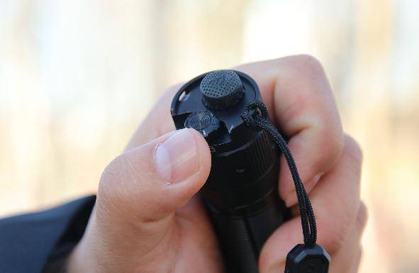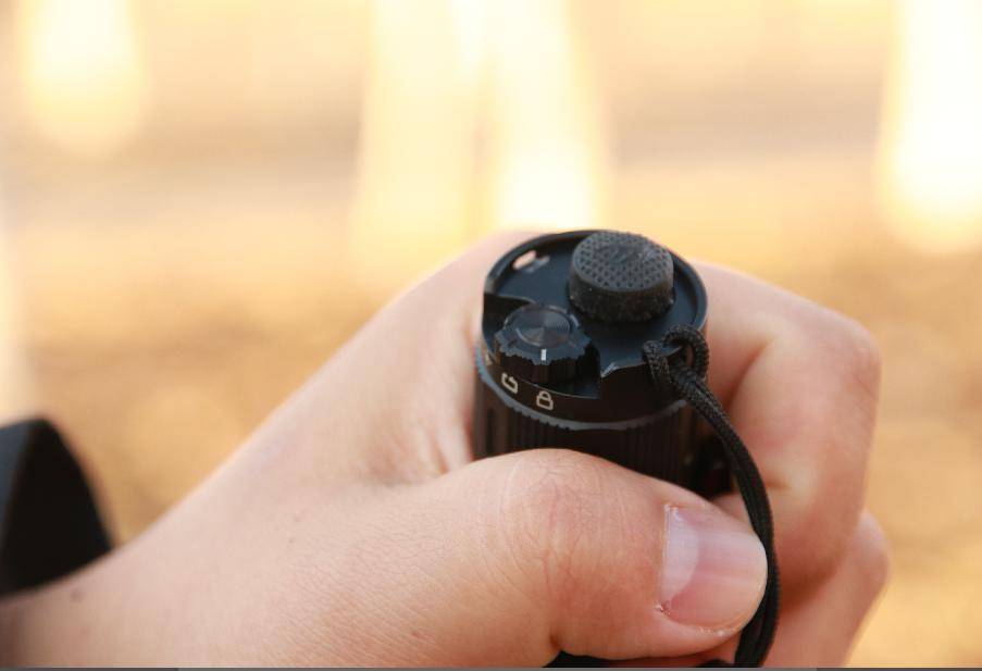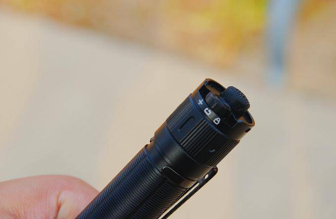 手电尾部的开关非常有意思,按钮式开关和机械拨盘开关两者互相结合,当拨盘处在锁定位置时,手电处于锁定状态,无法开机;