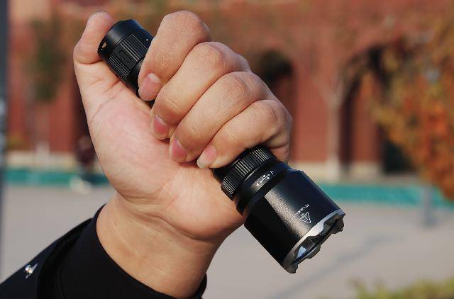 手电重218克,长158mm,这样的重量和尺寸拿在手里比较压手,但是持握非常舒服,大大的灯头不仅仅能够提高照射范围,更多的是一种震慑,再加上头部的攻击头,拿在手里安全感满满。