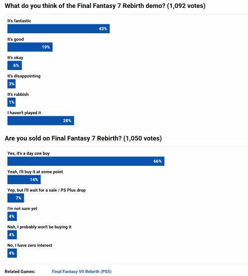 外媒pushsquare也发布了玩家投票,调查大家对《最终幻想7:重生》版的满意度。截至发稿,共1092名玩家参与了媒体调查,其中约62%玩家给出了好评,6%玩家表示体验一般,4%玩家认为并不理想。在另一份购买意向调查中,近80%玩家表示会购买《最终幻想7:重生》,66%玩家表示会首发入手。