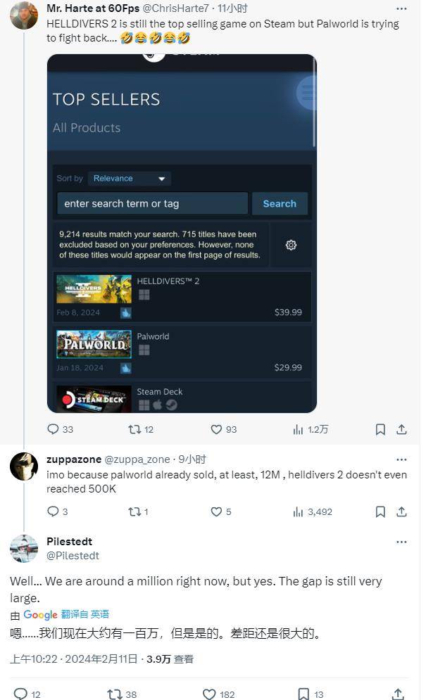 虽然索尼没有公布具体的销量数据,但 Arrowhead Game Studios 首席执行官 Johan Pilestedt 在 X 上透露,《绝地潜兵 2》目前已售出约 100 万份,这个数据已经超过了他们的预期,相比《幻兽帕鲁》还有一定差距。