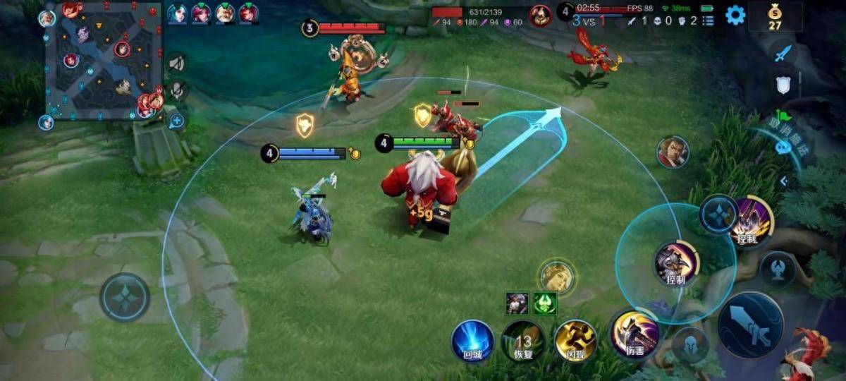 看第一张图三路兵线都是蛮不错的,是一个尝试上高地的好机会。但是射手和中边辅是脱节的,三个人想打中下,射手想打上路。