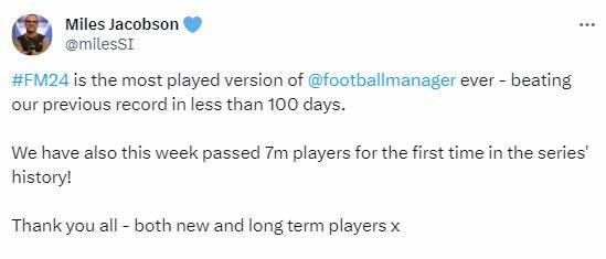 游戏总监Miles Jacobson今日宣布,《足球经理2024》玩家数超700万,成为系列历史上玩家最多的游戏。