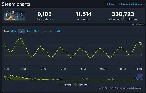 数据显示,在《星空》发行后不久,Steam在线玩家峰值达到了330723人,而现在它的玩家峰值最低已经下降到了9000人以下,最低在线峰值更是达到了4000人以下。相比之下,目前Steam上有超过2.5万名玩家在玩《上古卷轴5》。
