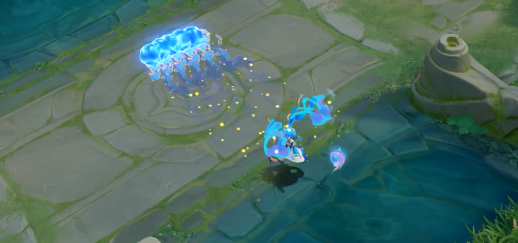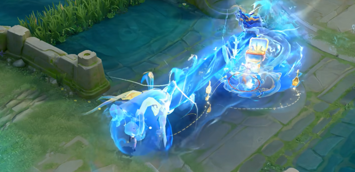 然后再来看局内特效。释放一技能的时候,我们可以看到安琪拉在身边凝聚出水球,然后交错释放。释放二技能时,我们可以看到腾跃飞舞的水龙环绕着宝船,向前推进。同样也是象征着海贸的繁盛。而大招的效果更为震撼。安琪拉在身边幻化出龙头,向前喷射出巨大的水柱。注意这里是有彩蛋设计的,伴随着水柱的转动,金色光芒环绕,我们得以窥见丝绸之路的繁荣景象,神龙旋转,便可以看清全貌。