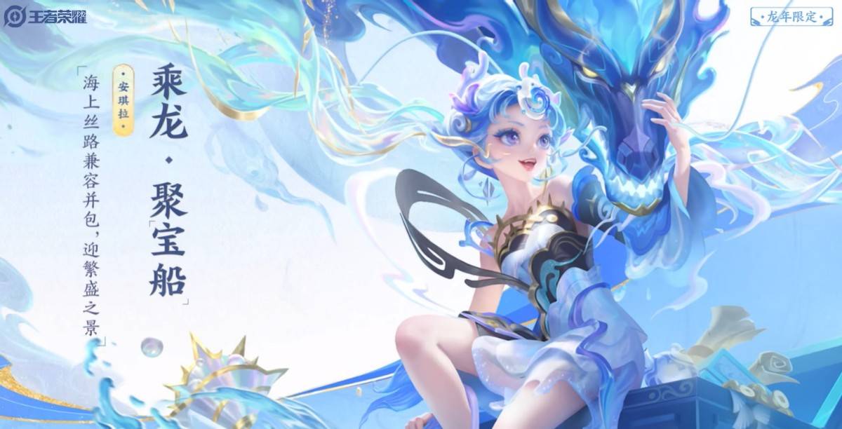 首先来看待机动画。安琪拉沿着波涛而行,水花四溅,水中百态之灵跃出水面,同安琪拉一同穿过辰龙之门。安琪拉与蓝色的神龙相伴,俏皮可爱的外表之后蕴藏着海贸繁荣之势。这款皮肤名为聚宝船。象征着海上丝路的历史。其待机动画也是向我们展示了我国古代欣欣向荣的海上贸易,玩家在看到精美演出效果的同时,也能体会到深厚的文化底蕴,意味深厚。