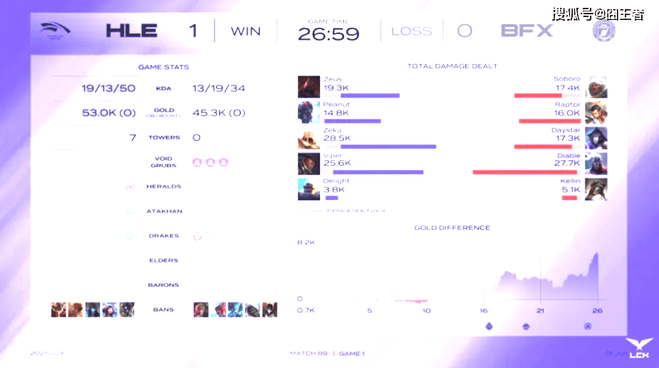 结果第一局比赛,被HLE打成了单方面的碾压局啊。比赛第5分钟左右,HLE三人抓上被反杀,BFX拿下一血;比赛第16分钟左右,河道爆发团战,HLE打出2换3;比赛第19分钟左右,BFX抓住机会打出0换2;比赛第22分钟左右,下路爆发团战,BFX打出2换2;比赛第26分钟左右,HLE打出0换4;最终26分59秒,HLE团灭BFX,先赢一局!