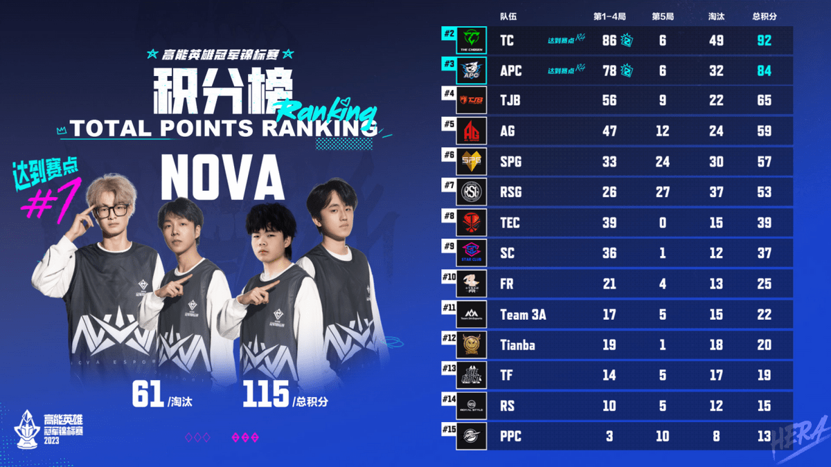 在这届高能英雄冠军锦标赛中,NOVA战队上演了一场逆流而上的精彩表演。他们在第一局只赢得了两分,可以说开局相当惨淡。但在第二局,他们逐渐找到了手感,成功拿下了15个淘汰。接下来的第三局和第四局,NOVA战队的小吱选手表现出色,战队一路势如破竹,从积分榜11位上升到了第2位。在第五局中,面对TC、APC和NOVA都拿到赛点的情况,NOVA战队通过了合理的战术选择和冷静的临场判断,最终笑到了最后,并夺得了首个高能英雄冠军锦标赛冠军。尽管他们的夺冠之旅并非一帆风顺,但他们的努力和才能最终得到了回报。