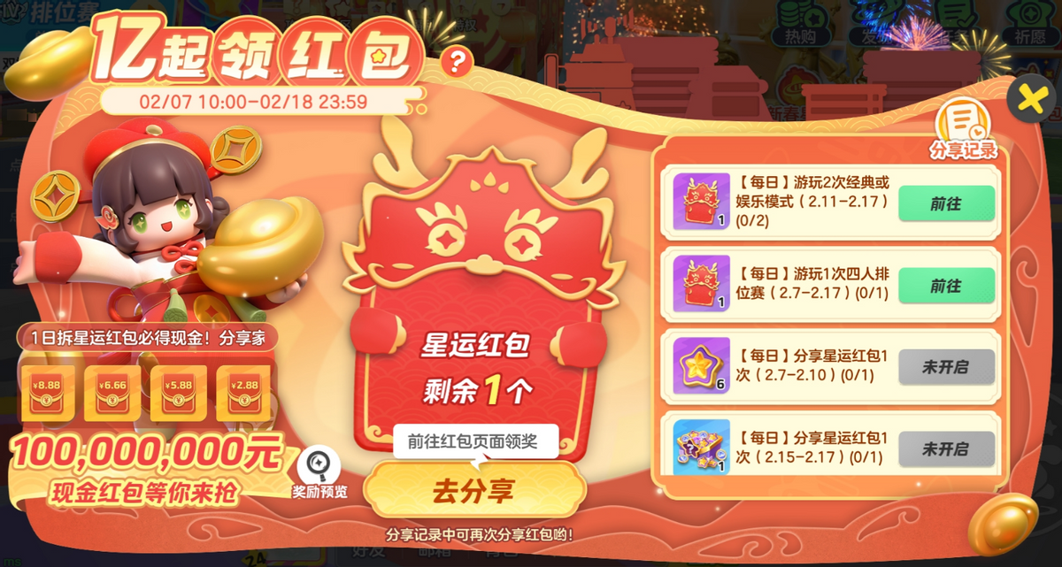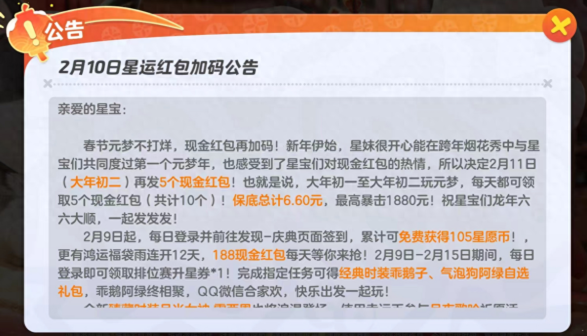 年初二领取红包的规则与昨天相同,各位玩家登上自己的《元梦之星》账号点击右上角的“亿元红包”图标即可参与。每人每天可以领取自己或者星搭子分享的红包总计5个,两天共10个红包,保底可以获得6.6元,如果运气真的特别好,次次188,则可以获得1880元的现金奖励!看来这个春节,大家线上线下的红包都能收到手软了。