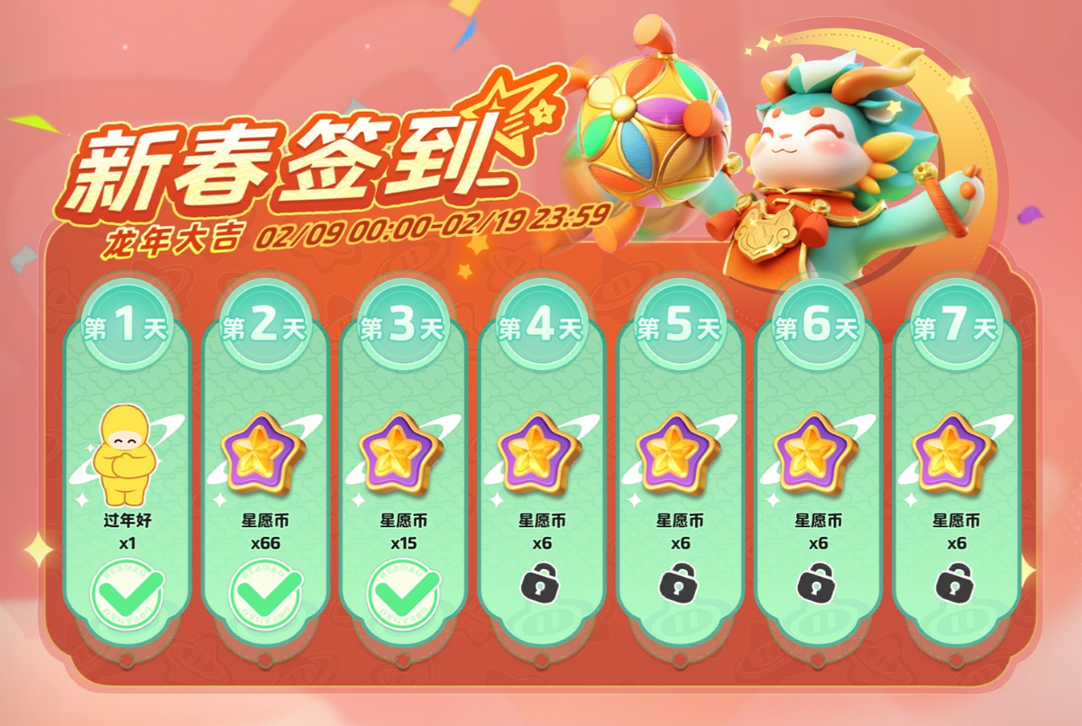 除了能够获得现金的“星运红包”之外,《元梦之星》也为玩家们准备了形式多样、奖励丰厚的活动,致力于让各位玩家这个春节都能游戏玩得尽兴、奖励拿得开心。例如“薅鹅毛”活动中,玩家们有机会免费兑换到腾讯视频月卡、QQ音乐月卡、星愿币,以及昵称“戚百草”的跆拳道少女、被称为“保安”的星梦守护者等热门皮肤;新春签到活动中,登录满7天便可以获得总计105星愿币;参与星梦广场集福活动,更有机会获得海底捞星运包、绝味鸭脖星运包等线下消费礼包。