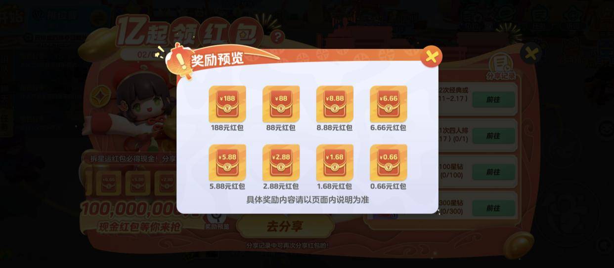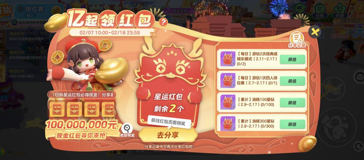 大年初二的活动规则也跟昨日如出一辙,各位星宝只需要登陆游戏后,点击并参与“亿元红包”活动,便可领取并分享“星运红包”。并且通过点开星搭子分享的红包链接,单个账号最高可领取五个“星运红包”。