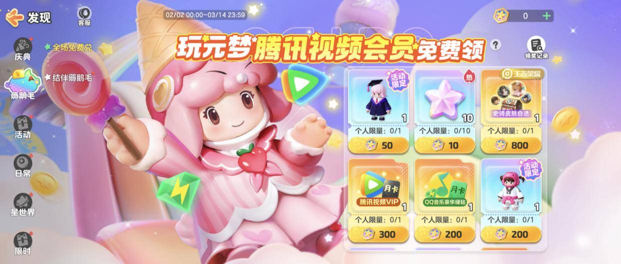 当然,除去现金红包外,各种薅鹅毛活动目前也在《元梦之星》里如火如荼地进行中。参与海底捞、瑞星咖啡、绝味鸭脖等品牌联动活动,便有几率获得无门槛代金券、满减券等福利。同时通过完成活动任务,玩家也能够获得福星币,并用于兑换游戏时装、腾讯视频会员、《王者荣耀》史诗皮肤等奖励。