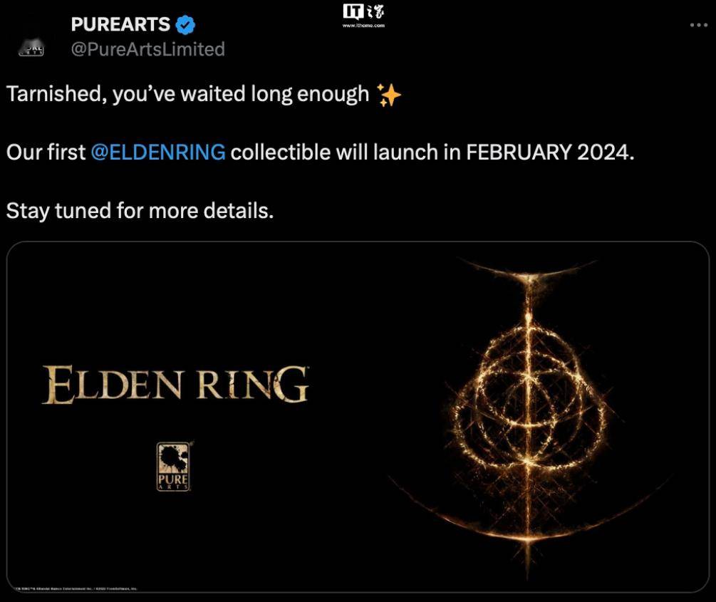 此前,游戏周边制造商 PureArts 1 月在 X 平台发表了一条《艾尔登法环》联动作品预告,其中暗示游戏 DLC“黄金树之影(Shadow of the Erdtree)”将与该公司的周边手办一起在 2024 年 2 月发布。