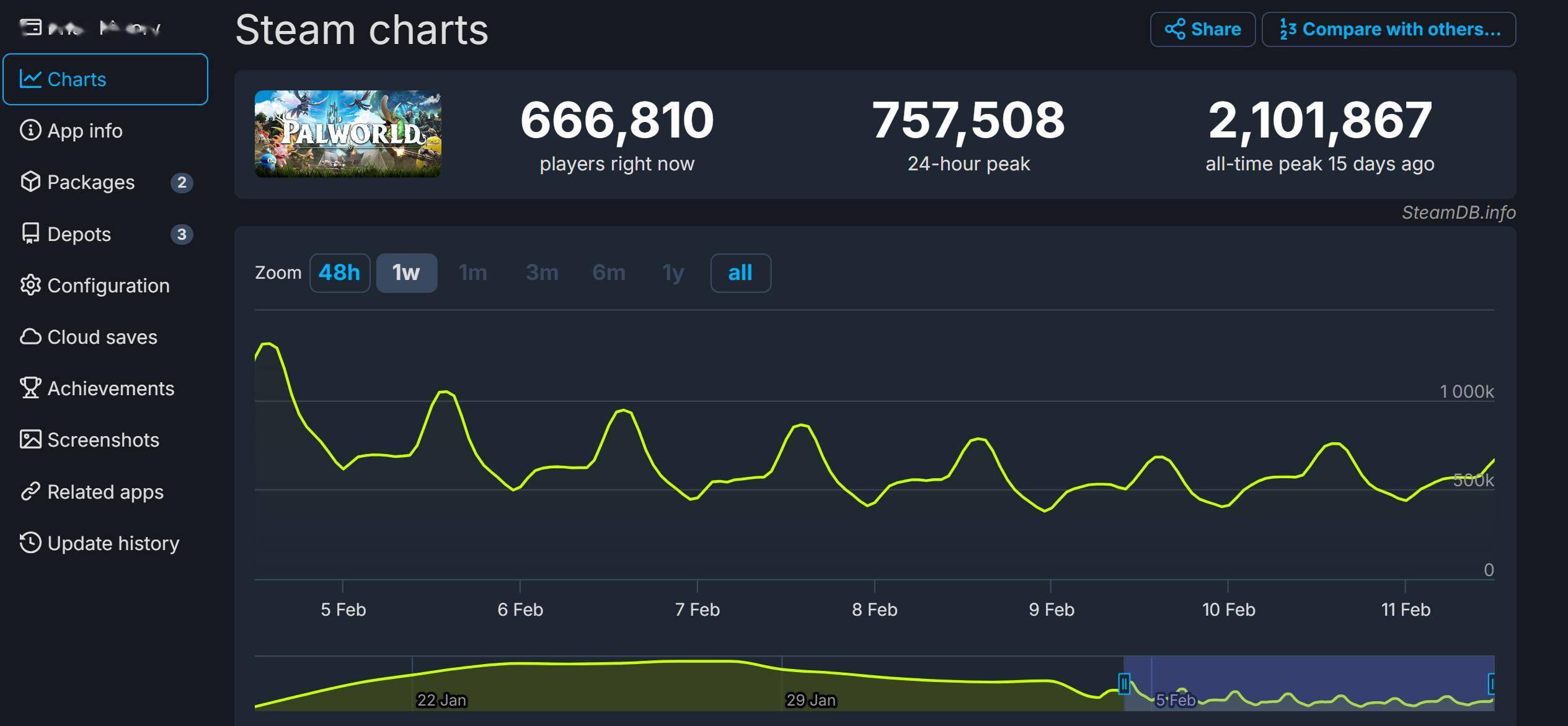另外,据SteamDB,《幻兽帕鲁》24小时峰值为75.75万,相比15天之前的最高峰值210.1万下降了134.35万,还是比较厉害的。