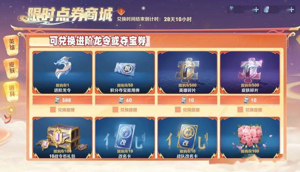 其三是限时点券不够用的玩家,若在集齐大部分高级皮肤的情况下,大概率会开出188或488限时点券,不想要皮肤的玩家,也可刷出限时点券兑换进阶龙令或是积分夺宝券等奖励。
