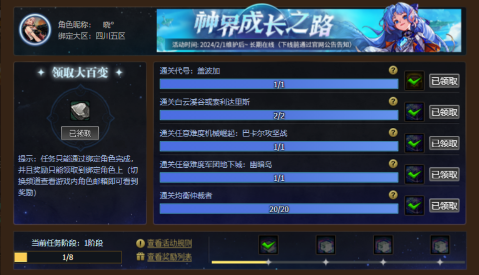 “神界成长之路”,该活动绑定角色后即可获得1000个悬浮石(可以通过任务兑换大百变)。
