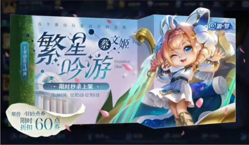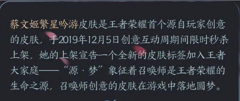 源梦系列的第一款皮肤,蔡文姬的繁星游最早上架于2019年的12月5日。