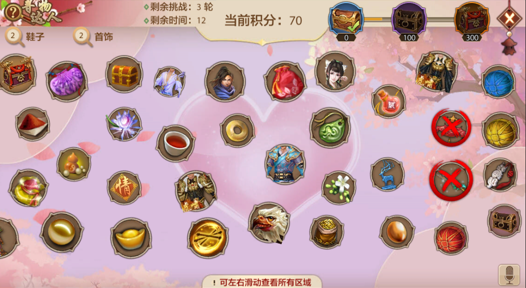 活动开启后,游戏界面上将显示多种物品的组合,系统会提示少侠需要寻找的目标。每局游戏将分为多轮挑战,少侠们需要配合,并在每一轮挑战的倒计时结束前寻找到尽量多的目标,以赚取更多的分数。