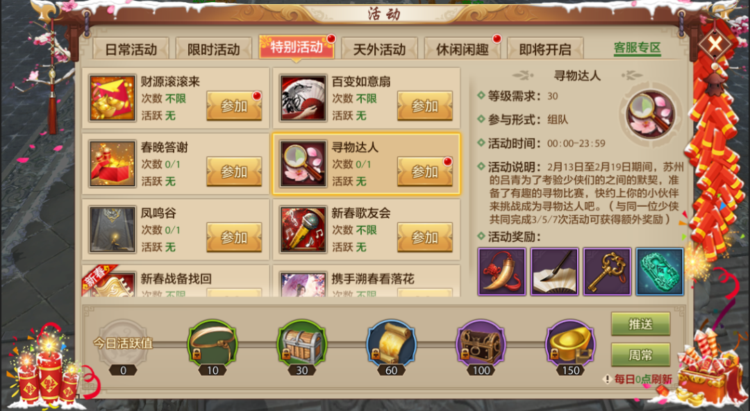 不过这倒是提醒了老赵,再过几天就是情人节了,江湖里就没有为侠侣准备新花样吗?当然不是!一场别开生面的趣味活动——寻物达人即将开启。考验双方默契的时刻到了。在参与活动寻找物品的过程中,少侠们不仅可以增进感情、共度浪漫佳节,还有多种宝箱好礼待领取!
