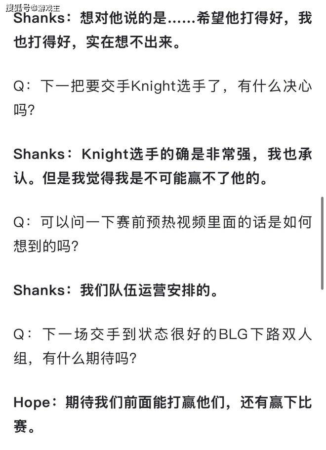 决胜局的对抗又是圣枪哥扛住压力,老牌奥恩多次完美开团击飞wbg战队多人。3比1拿下了wbg战队之后,al战队也是成功进入到了lpl赛区胜者组的决赛,和blg战队争夺LPL第一个晋级msi的名额。赛后采访中也明显能够感觉得到al战队的众人是非常紧绷的,作为中单选手,香克斯的压力应该是比较大的,甚至他还表示,中单knight确实非常的强,我也承认,但我觉得我是不可能赢不了他的。利用双重否定来给自己加油打气。同样,主教练tabe也发表了自己的看法,Blg战队现在整体的表现应该是公认lpl赛区最强。