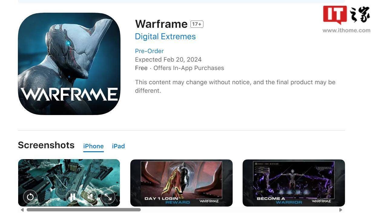 《Warframe》iOS 版已上线 App Store 商店,大小为 104.1 MB,IT之家提醒,需要 iOS 14.0 或更高版本系统以及配备 A12 Bionic 芯片或更高版本的 iPhone 和 iPad。