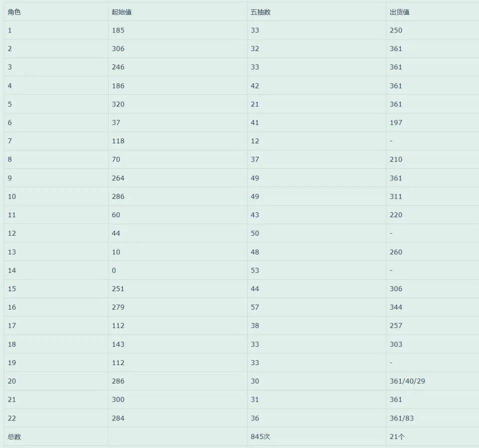 在845*5=4225次抽取中,22个号成功获得了21颗水晶。其中,满361必出的水晶占据了8颗,占据总数的38.1%。