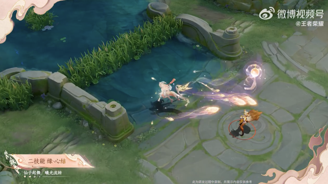 在貂蝉的设计上,小王围绕“曦光仙子”的设定,如晨曦般充满希望,更加强调与魔尊的身份对立感受,同时融入了剪纸的形式感,打造更具东方感受的仙魔之恋。以中国传统颜色赪霞为主的淡雅衣裙,搭配上融入太阳元素的不对称浮空披帛,更加独特;更多的运用满日、游鱼、云纹等符合曦光仙子身份的元素,凸显仙气。