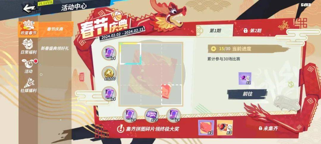 从2月2日到2月15日24点,春节庆典活动开启,只需完成两期拼图任务,就能获取群星汇集券、联动球星券以及庆祝动作“发红包”等奖励。活动只剩最后一天,还没有拿满奖励的街球手赶紧冲冲冲!