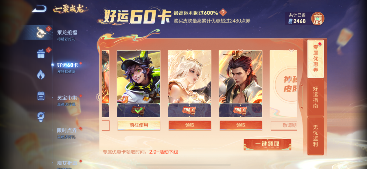 想要入手这两款情侣皮肤的玩家,可以参与好运60卡活动。 60卡用户可以立刻获得两张价值358点券的优惠券,在60卡页面还可额外参加一次无忧返利抽奖。加上首周的优惠,以1072点券的价格就能获得限定的传说级皮肤,十分划算。