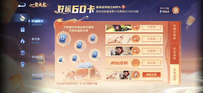 如果您购买了龙年好运60卡的话,每一款皮肤最低只需要1072点券,还可以领取一个曦玄令,在60卡页面可额外参加一次无忧返利抽奖,机会难得。
