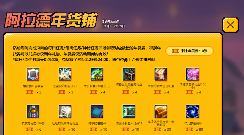 近期DNF也开启了不少网页活动,比如这个阿拉德年货铺,每天完成任务,就能换年货券。6张券子,即可兑换疲劳药。小年欢乐聚页面,随便点一点,也能换5点疲劳药。更多活动大家可以在D助上查询。