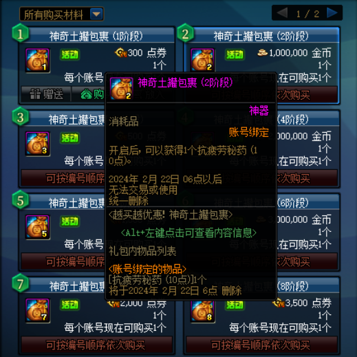 近期游戏内上线了“神奇的土罐”活动,在2、4、6阶段时,可以直接用金币购买10、30、50点疲劳。不过要注意,神奇的土罐包裹只能按阶段一次购买,也就是1阶段买完,才能解锁2阶段,3阶段买完,解锁4阶段……好在这里可以用代币券,只要金币足够多,完全能买光。
