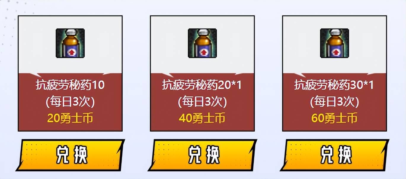 在充值返利页面中,可利用勇士币兑换疲劳药。总共有5点、10点、20点、30点这4种类型,每日限购3次,需要特邀及以上的玩家才可以进行兑换,勇士币可通过充值获得。