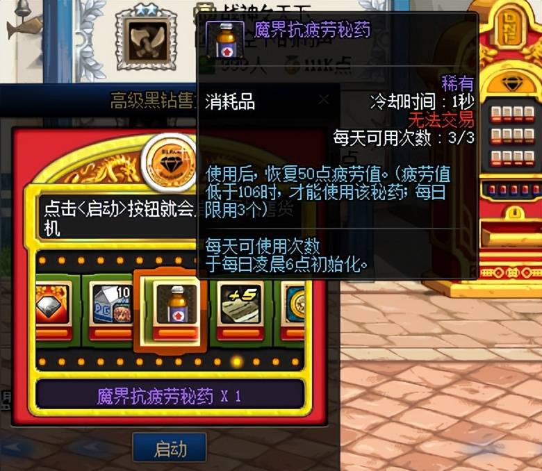 只要你经常刷图,相信背包里的黑钻硬币肯定不会少。在黑钻售货机中,不仅有各种血药、蓝药,还有小概率抽到50点的疲劳药。