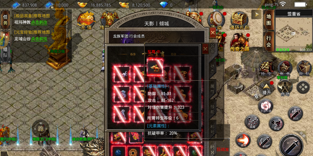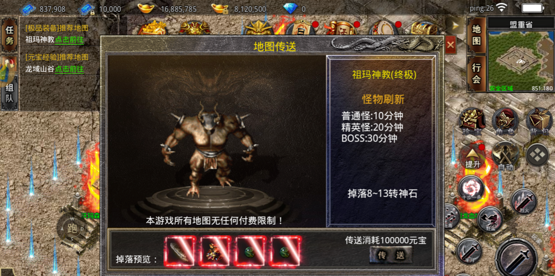 在前期,祖玛神教是一个非常适合玩家去探索的地图。根据我个人的测试,这里的装备和材料爆率相当高,有很大机会可以获得8-13转的装备和材料,甚至还有机会掉落终极装备。如果真的能打到一件终极装备,那就意味着你可以快速提升自己的实力。但我要提醒大家,尽管爆率高,也要量力而行。如果你实力不够,可能会适得其反,甚至被直接送回城。当然,如果你是大佬级别的玩家,可以忽略我的建议,直接跳到下一个地图——魔龙岭。那里的装备爆率同样不俗,而且元宝资源也相当丰富。