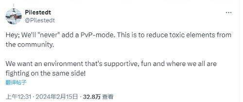 他表示:“我们'永远'不会添加PvP模式。这是为了减少社区中的有毒元素。我们希望有一个相互支持、充满乐趣、大家站在同一战线上战斗的环境!”