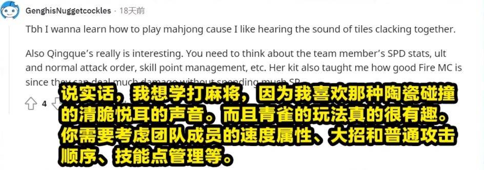 大家不要以为青雀只是在国内火,身为重现了帝垣琼玉牌的天才打牌少女,青雀在海外的人气同样高的可怕,甚至有老外因为青雀而产生了学习打麻将的年头。米哈游创造的这个一个虚拟角色居然意外的给老外安利到了咱们的国粹,这真是有够魔幻的。