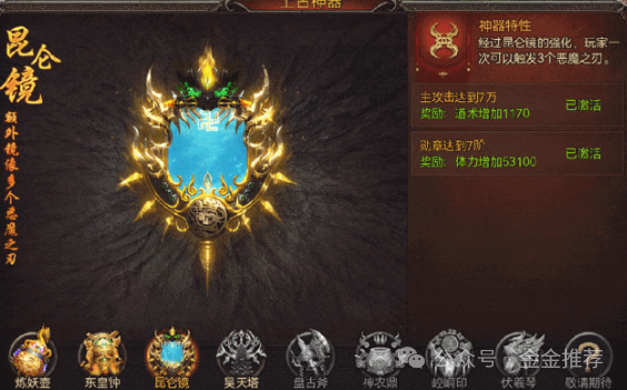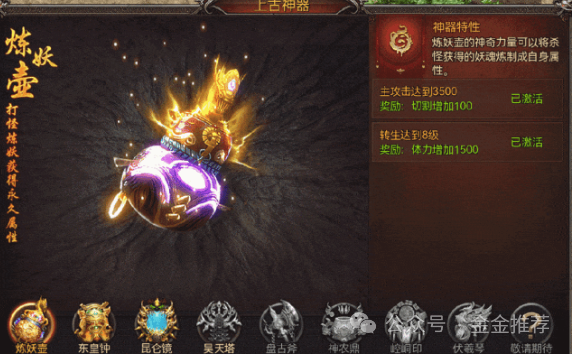 在上古神器的部分,通过完成聚灵任务就能弄到上古灵气啦。所谓上古神器其实就是碎成五片的碎片,把上古灵气合在上古神器碎片上就能激活啦!激活之后就能附加角色属性啦!比如炼妖壶啦,激活了以后在战斗过程中就能捕捉妖魂,然后在炼妖壶里炼化一番。炼制成功就能拿到额外数值加成啦!