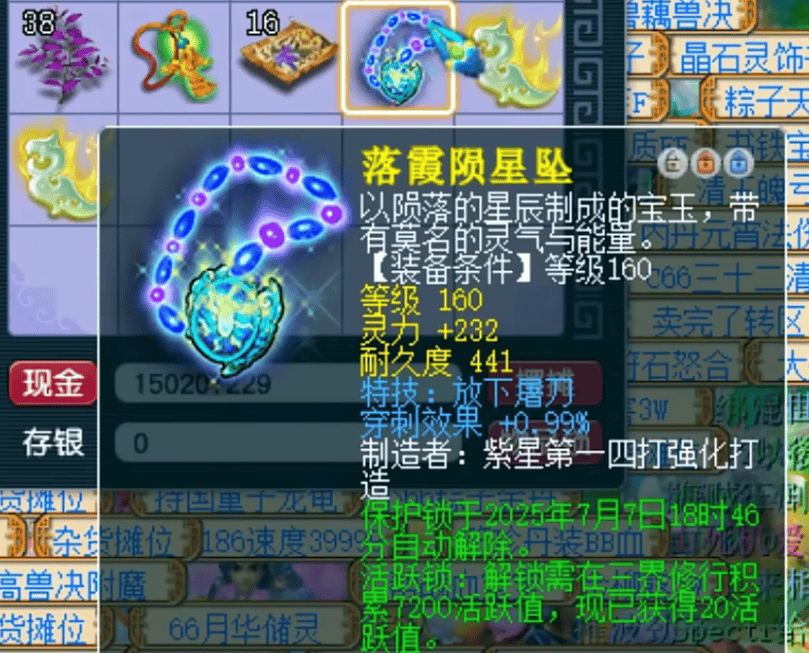 玩家获得的这条项链拥有232点初始灵力,并附带放下特技以及0.99%穿刺的双蓝字组合。该项链的基础属性非常出色,其特技能够有效削弱敌方物理系输出,而穿刺效果则可提升自身物理伤害。在当前版本中,这件装备非常适合物理系角色佩戴,既能为队伍增添一个团队型特技,又能为队友释放一个特技部位。