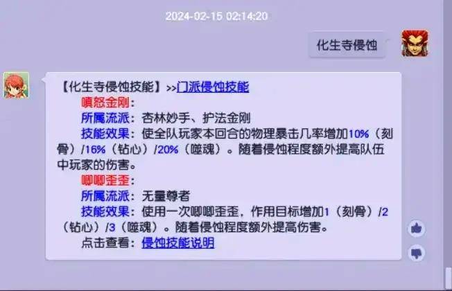 化生寺不推荐侵蚀,该侵蚀技能咋一看效果很炸裂,奶脉化生提高全队20%物理暴击概率、秒脉化生触发侵蚀最多可秒7。但是相较于原有的乾元丹而言,都是“锦上添花”。