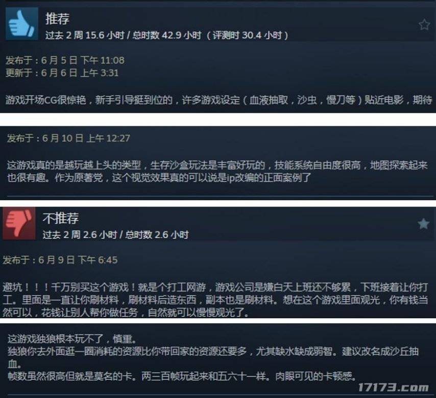 差评主要是内容太肝,对孤狼玩家不友好。有差评玩家吐槽,这就是一款打工游戏,游戏公司嫌白天上班还不够累,下班接着让你打工。还有差点被渴成干尸的孤狼玩家吐槽,建议改名成《沙丘抽血》。